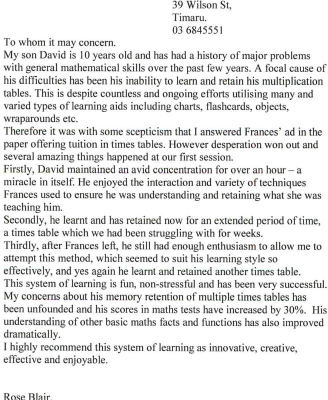 After learning that her technique was one of those things that doesn't come along every day, Frances wrote a book to help as many children as possible benefit from this simple yet wonderful technique. (This book was put aside after Frances discovered that her system was still growing and adapting as she visited and taught at schools. She then wrote Elephants Never Forget Their Times Tables and completed it after 3 years.)